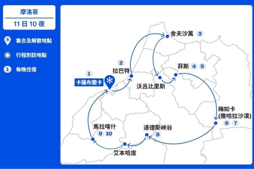 卡薩布蘭卡 → 舍夫沙萬 → 菲斯 → 中阿特拉斯山脈 → 梅如卡(撒哈拉沙漠) → 達德斯峽谷 → 艾本哈度 → 馬拉喀什 → 卡薩布蘭卡