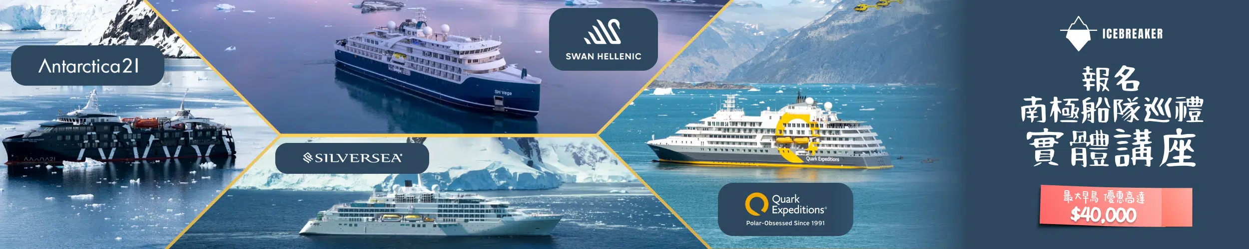 我們將會舉辦全港首個南極峰會,同場集結四間最頂尖極地郵輪公司:奢華體驗的 Silversea、專業探險郵輪 Quark、飛越德雷克海峽的 Antarctica21 及精品文化郵輪 Swan Hellenic。各郵輪代表將親自到場,並有曾經到訪極地的嘉賓一同分享,更有專家與你一對一拆解行程細節。