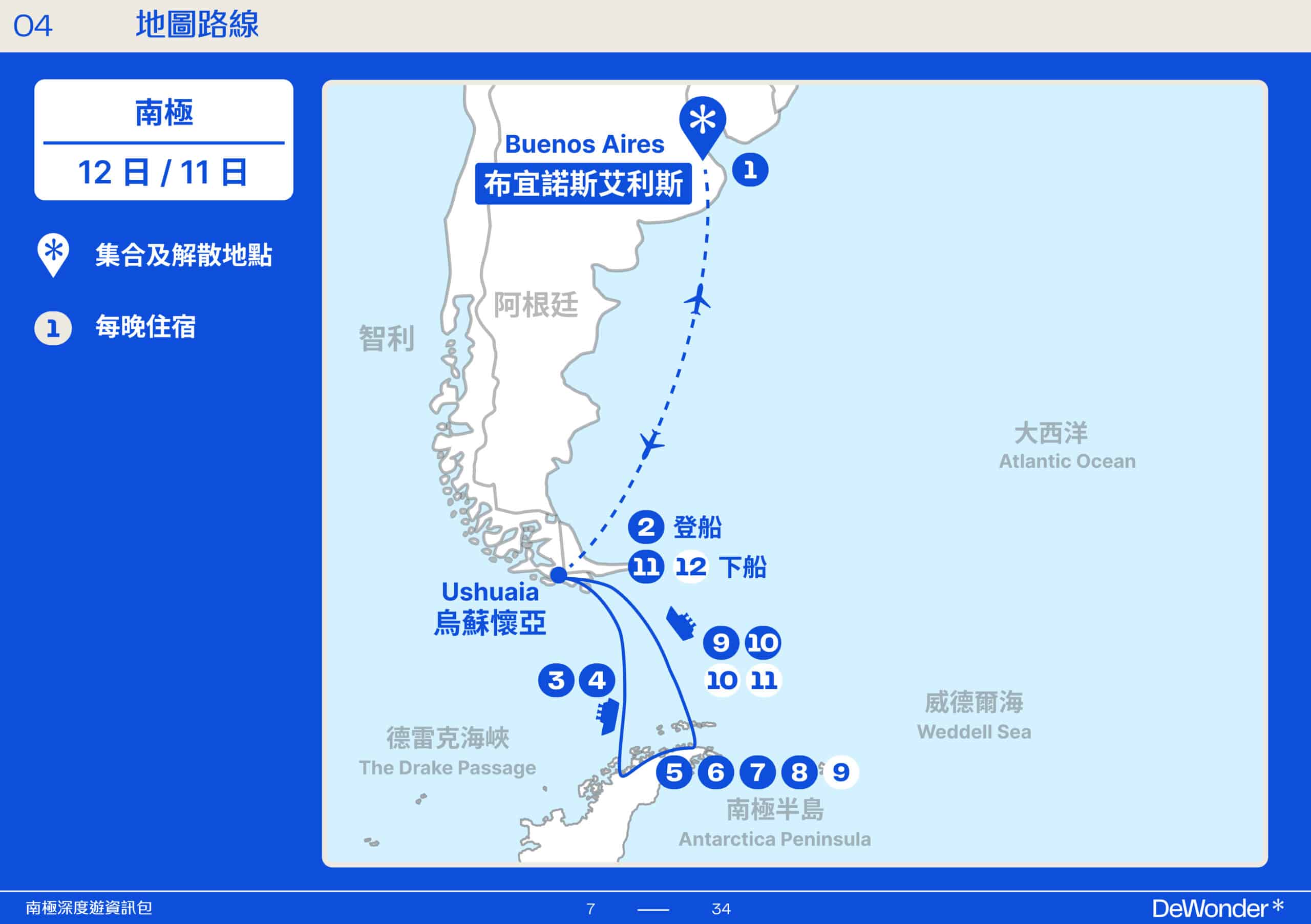 從阿根廷烏蘇懷亞(Ushuaia)出發,穿越德雷克海峽,前往南昔得蘭群島和南極半島,搭乘Quark Expeditions的172人中型船World Explorer,配備穩定器和24小時醫療支援。如果你由香港和 DeWonder 團隊一起出發,建議航班如下: