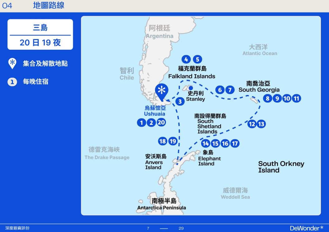 烏蘇懷亞 (Ushuaia) → 福克蘭群島 (Islas Malvinas) →南喬治亞 (South Georgia) → 南昔得蘭群島及南極半島 (South Shetland Islands & Antarctica Peninsula) → 德雷克海峽 (Drake Passage) → 烏蘇懷亞 (Ushuaia)