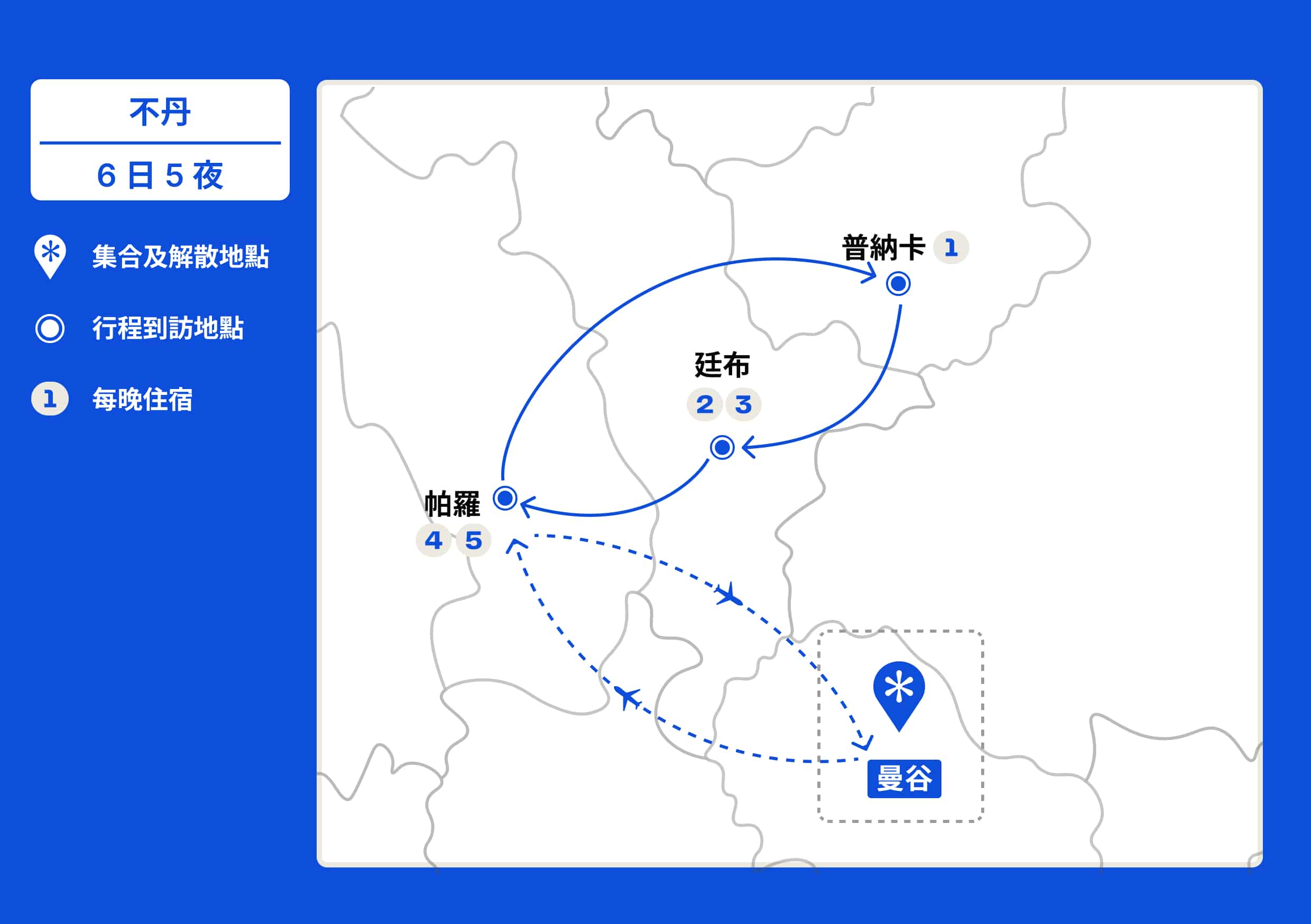 曼谷 (Bangkok) → 帕羅 (Paro) → 普納卡 (Punakha) → 廷布 (Thimphu) → 帕羅 (Paro) → 曼谷 (Bangkok)