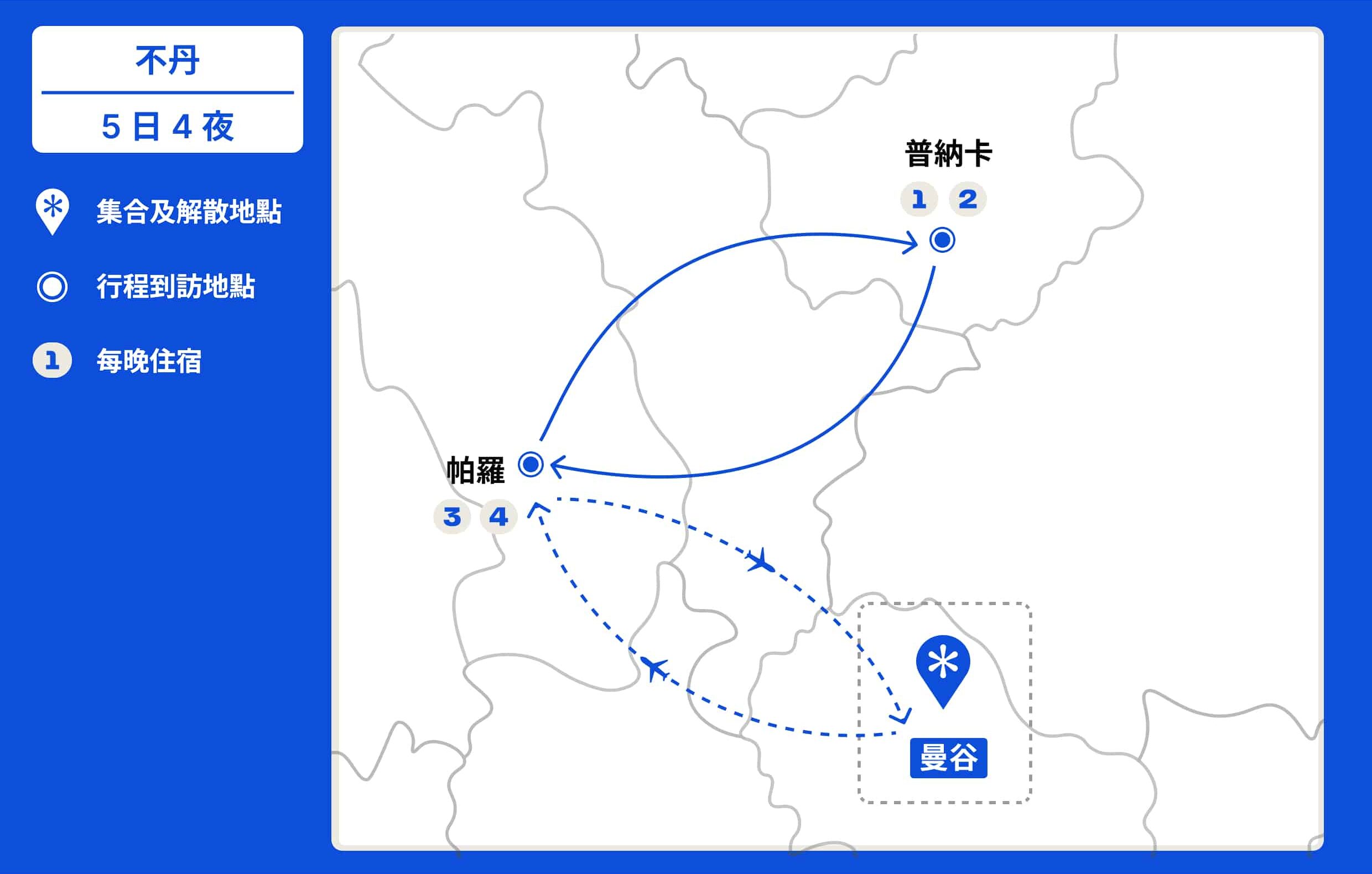 曼谷 (Bangkok) → 帕羅 (Paro) → 普納卡 (Punakha) → 帕羅 (Paro) → 曼谷 (Bangkok)