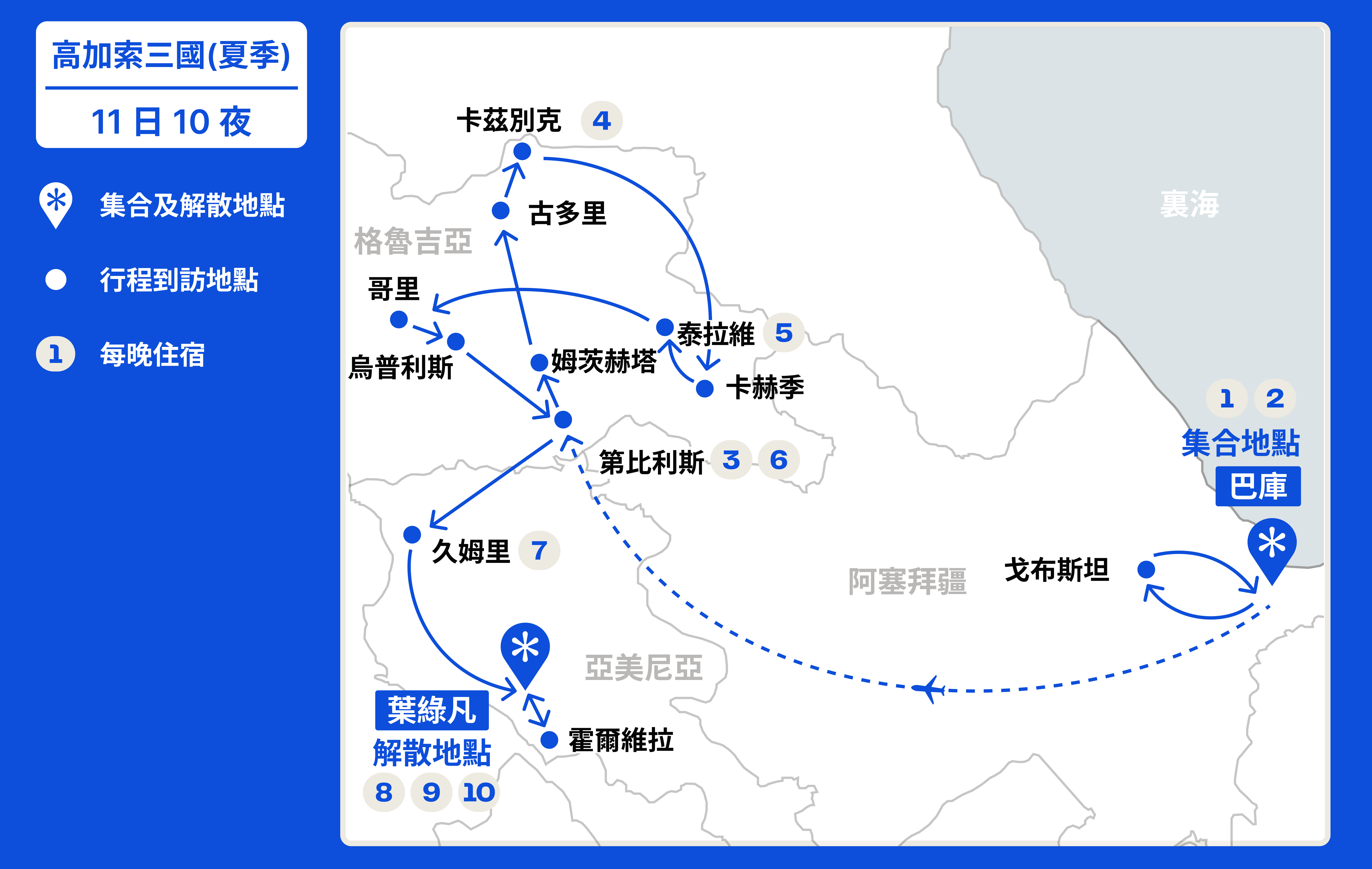 阿塞拜疆 (Azerbaijan): 巴庫 (Baku) → 格魯吉亞 (Georgia):第比利斯 (Tbilisi) → 姆茨赫塔 (Mtskheta) → 古多里 (Gudauri) → 卡茲別克 (Kazbegi) → 卡赫季 (Kakheti) → 泰拉維 (Telavi)→ 哥里 (Gori) → 烏普利斯 (Uplistsikhe) → 第比利斯 (Tbilisi) → 亞美尼亞 (Armenia):久姆里 (Gyumri) → 葉綠凡 (Yerevan) → 霍爾維拉 (Khor Virap) → 葉綠凡 (Yerevan)