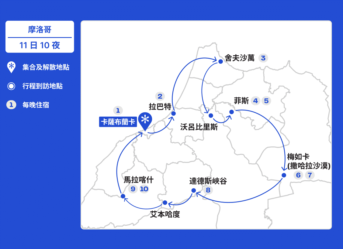 卡薩布蘭卡 (Casablanca) > 拉巴特 (Rabat) > 舍夫沙萬 (Chefchaouen) > 菲斯 (Fes) > 中阿特拉斯山脈 (Middle Atlas Mountains) > 梅如卡 (Merzouga) > 達德斯峽谷 (Dades Gorge) > 艾本哈度 (Ait Benhaddou) > 馬拉喀什 (Marrakech) > 卡薩布蘭卡 (Casablanca)