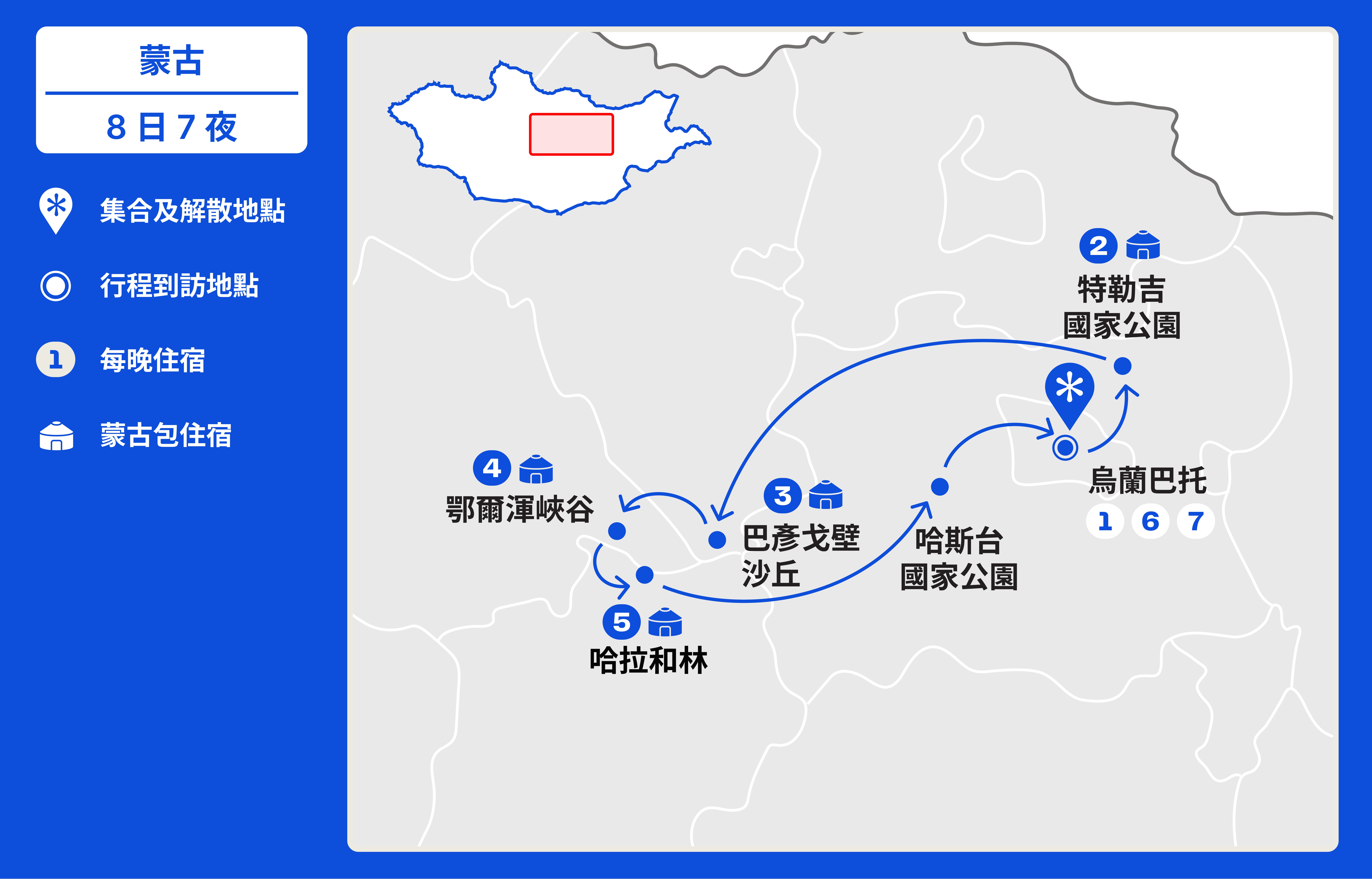 烏蘭巴托(Ulaanbaatar)→ 特勒吉國家公園 (Terelj National Park)→ 巴彥戈壁沙丘 (Mini Gobi) → 鄂爾渾峽谷 (Orkhon Valley) → 哈拉和林 (Kharkhorin) → 哈斯台國家公園 (Khustai National Park)→ 烏蘭巴托 (Ulaanbaatar)