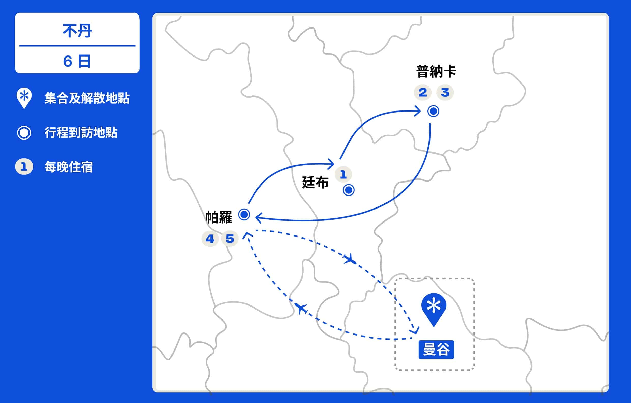 曼谷 (Bangkok) → 帕羅 (Paro) → 廷布 (Thimphu) → 普納卡 (Punakha) →  帕羅 (Paro) → 曼谷 (Bangkok)